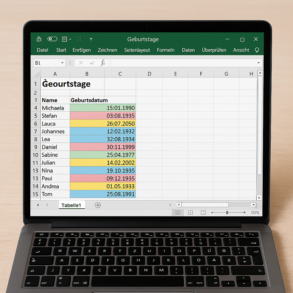 Lösung: Unsere Tabelle zeigte automatisch in dem gewünschten Abstand an, wann ein Geburtstag ist und wie alt die Person wird. Demnach musste man nur noch nach den Tagen bis zum Geburtstag filtern oder nach den Farben ausschauen halten (Rot = nur noch 7 Tage bis zum Geburtstag; Gelb = noch 14 Tage; Grün = mehr als 14 Tage). Noch kleine weitere Features wurden ergänzt, um das Arbeiten in der Datei möglichst angenehm zu gestalten.